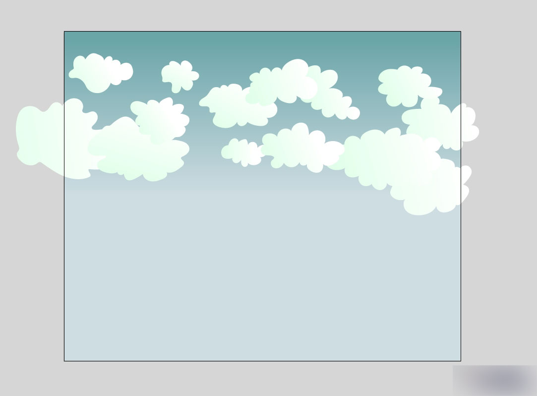 再画上其他的云朵,每片云朵尽量要手绘,不要用复制粘贴的办法。每画好一片云朵,相应调整一下渐变的角度。想象阳光是从云层上照射下来,因此不同位置的云朵就有不同的阴影和高光。让这些云朵覆盖差不多半个画布。