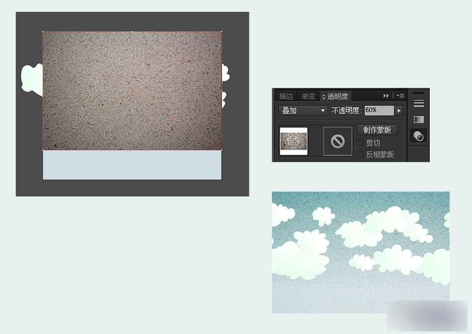 进入【文件>置入】,打开我们已经下载好的三个纹理中的纹理1,将纹理1等比拉伸至与画布等宽的大小后,再点击工具属性栏中的"置入"按钮。选中置入后的纹理。打开透明度面板,在面板中将图层混合模式改为"叠加",透明度降至60%。