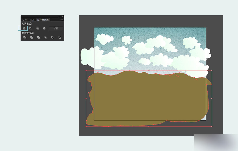 将这一步画好的所有图形(群山+峡谷+地面)全部选中,复制(Ctrl+C)再粘贴到前方(Ctrl+F)。在选中复制层的同时,使用快捷组合键Ctrl+Shift+F9打开路径查找器,在路径查找器里点选"联集",也就是形状模式左边起第一个图标。