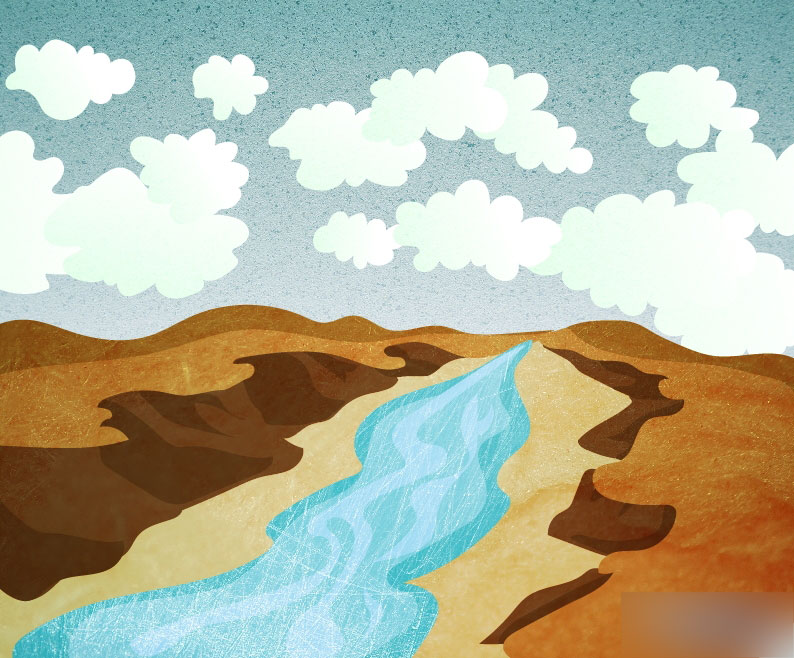 再采用与之前叠加群山和峡谷部分的纹理一样的步骤,复制河流的图形,置入纹理2,再将复制层贴于上方,与纹理一起创建一个剪切蒙版。改变剪切蒙版为叠加混合模式。