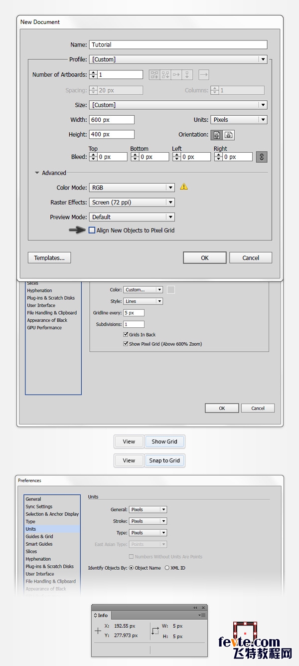 Ctrl-N创建一个新的文档, 从单位下拉菜单中选择像素,宽度和高度为600×400。然后点击高级按钮。 选择颜色模式为 RGB,屏幕(72ppi), 去掉勾选"使新建对象与像素网格对齐"。
