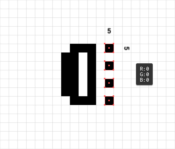 使用矩形工具(M),画四个5像素的正方形,确保填充颜色为黑色,然后将它们如下图所示摆放。