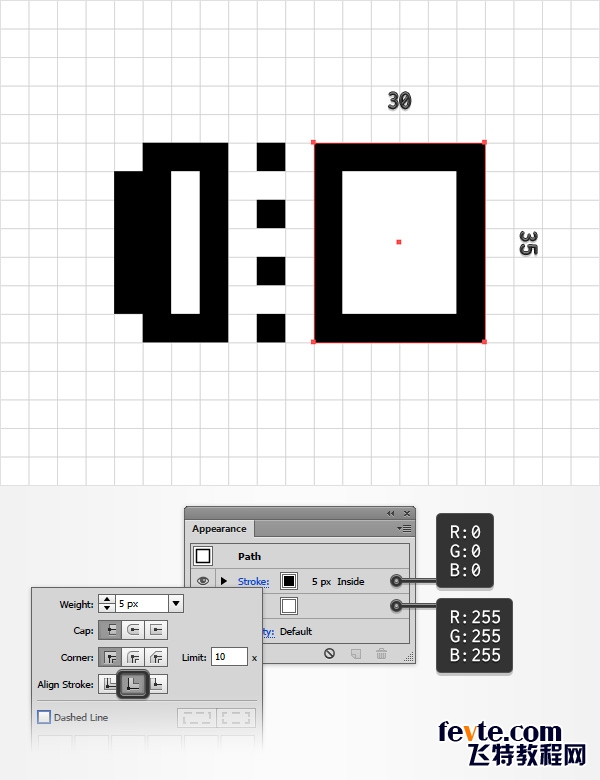 使用矩形工具(M),创建一个30×35 PX的矩形,如下图所示,并保持它在选中的状态,可以打开外观进行观察。(窗口>外观)。