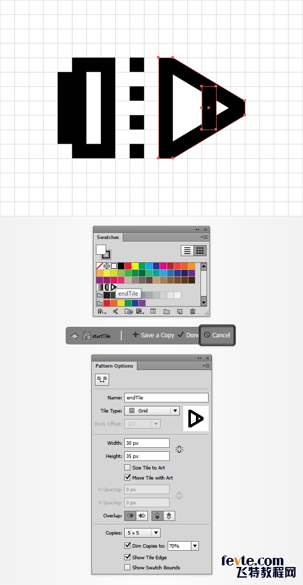 选中如下三个矩形,打开色板(窗口>色板),并按着鼠标将它们拖入色板中,存储为新的图案。在空白处点击一下,双击新的图案,重新命名为"starttile"(设置如下图所示),然后点击"取消"。