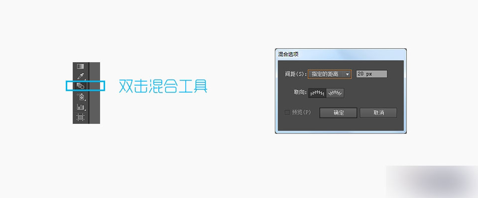 这时,让我们在软件界面左侧工具栏中找到混合工具,双击混合工具的图标,将会在画布上弹出混合选项对话框。在这里你可以参考我的参数,我对混合间距设置为指定的间距,间距距离是20px。对于这里的参数需要加以理解,由于我在之前设置直线的大小是5px,因此,当它们间隔时最好是5的倍数,最终的效果才会显得更加自然。当然这样的造型会显得比较平稳,而打破平静需要更多的加工和构思。