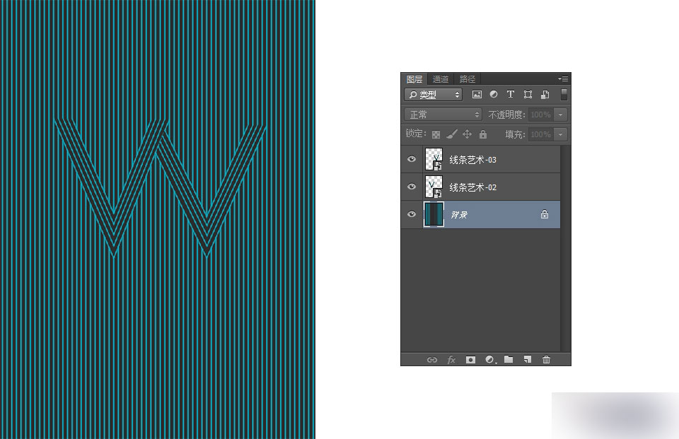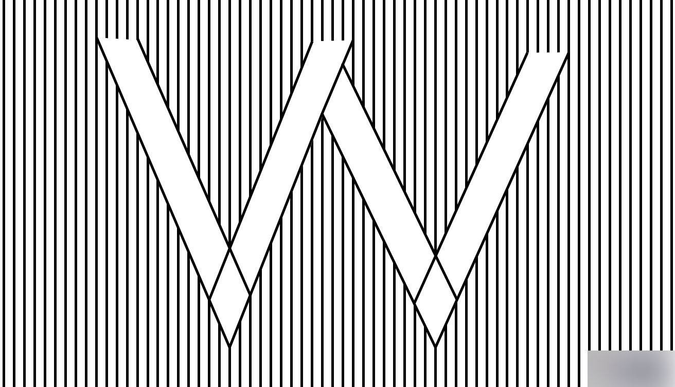 我们开始进入用线条造型,在前言中,我们提到过,要把每根线条视作一个"点"来进行造型。那么具体操作是,先要画出你所要表现的造型线条。你可以使用钢笔工具,也可以用直线工具。例如,我在此要做的是字母"W"。线条的粗细与背景线条的直线大小一样为5px。