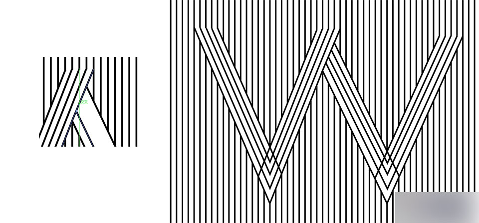 为了方便我们为线条造型"打底",让我们把目前所画的线条全部锁定(ctrl+2)。采用钢笔工具,关闭描边,填充白色,在这个字母的背后,也即两条线的中间部分填充白色的背景。然后把白色背景置于线条造型的底部,当然是在整个画布背景之前。