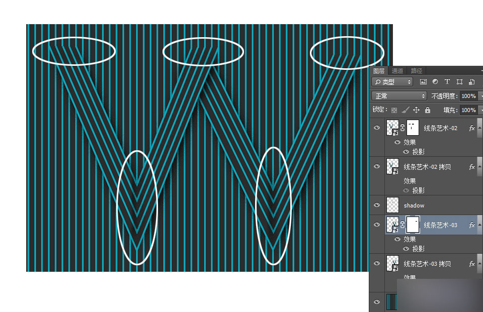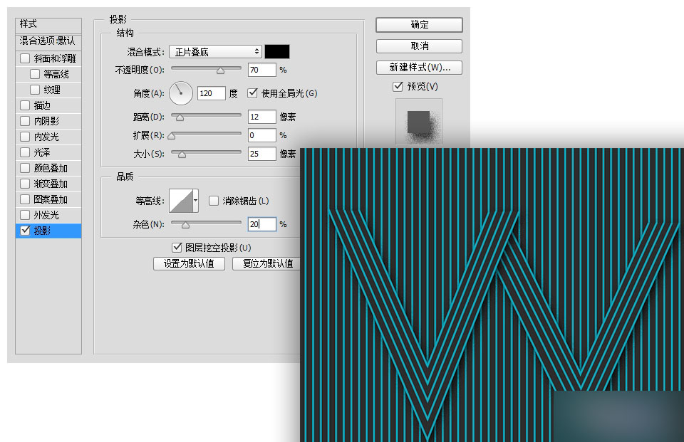 在此我增添一点杂色效果的投影,目的是为了渲染一种更加逼真的气氛。对于造型的左右两个V,要确定好他们的叠放层次。
