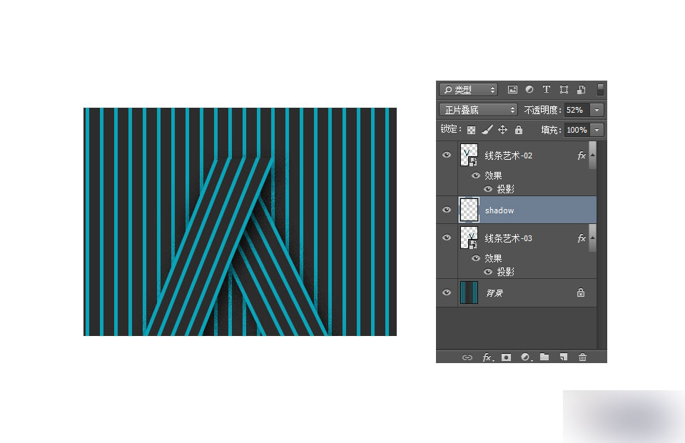 在两个图层之间新建一个图层shadow,用大而软的黑色笔刷对准他们相叠加的部分涂黑,然后把shadow图层改为正片叠底,透明度降低到52%。做这一步的目的是为了更完善整个造型的投影。