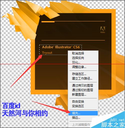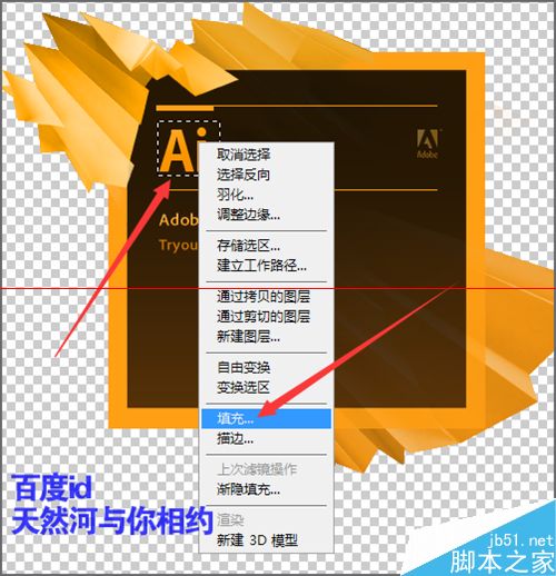 7、接着我们在工具栏中选择矩形选框工具。需要把我们图片上的字进行一个选取。用矩形选框工具的时候,选择的范围也不在太大。选择好后在选框上面右键点击,在下拉列表中选择填充。也可以在编辑菜单中选择填充。