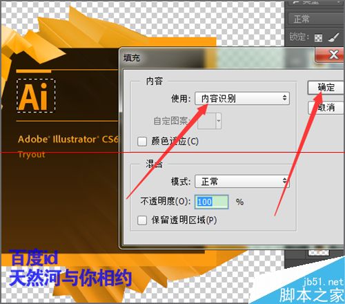 8、选择好后,在弹出的填充界面中它默认的是颜色,我们点击它旁边的下拉小三角选择内容识别。然后点击确定。