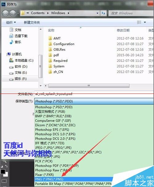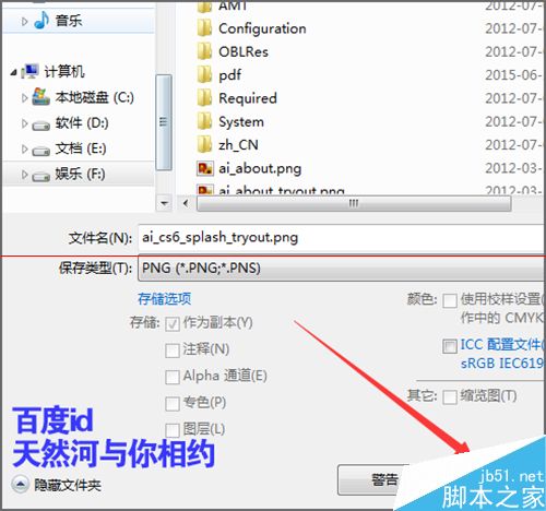 12、选择好后点击保存。接着它会弹出一个确认另存为的提示界面。ai_cs6_splash_tryout.png已存在。要替换它点击是。保存之后这个图片选择不要进行关闭。我们还需要用它上面的文字。