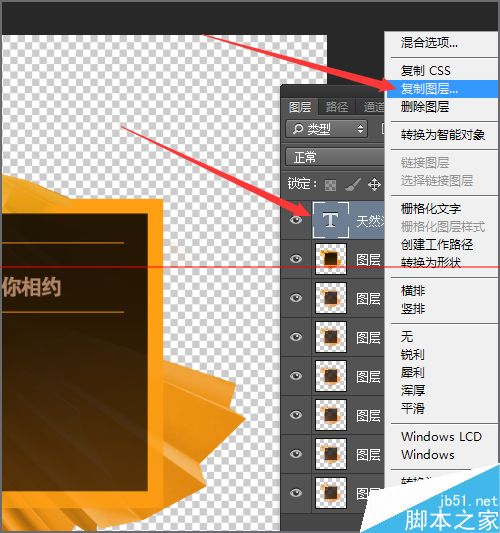 13、接下来就要把另一张的图片也从它的安装目录中拉入到ps中。它的制作方法和上一张的图片制作是一样的。这里就不多做说明。只把它的文字进行一下补充。选择第一次制作的图片,然后在它的文字上面右键点击一下,在它的列表中选择复制图层。