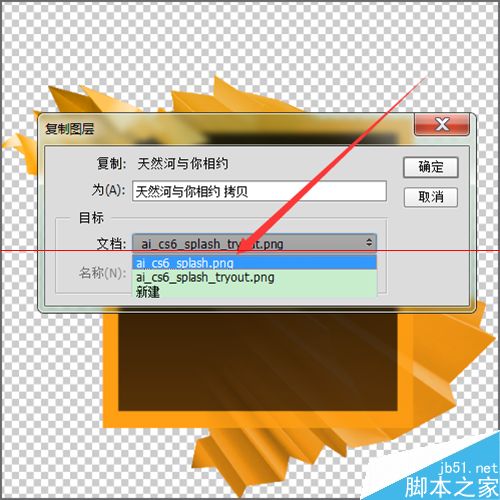 14、在接下来打开的复制图层的面板中,在它的目标文档上面点击一下,选择ai_cs6_splash.png的图片也就是第二张图片。然后点击确定。