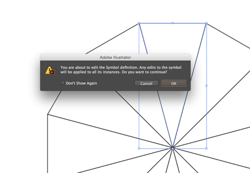 双击第一个三角形来编辑符号,此时弹出的警告窗口提供了这个功能的说明:对于一个符号所做的任何编辑将被应用于它的所有实例,也就是说,我们只需在一个符号中创造图案,然后它就将被复制到所有符号,形成完整的图案。