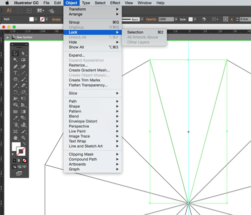 去掉三角形的描边,然后锁定它以避免不小心被移动。拉一条穿过图形中心的参考线。