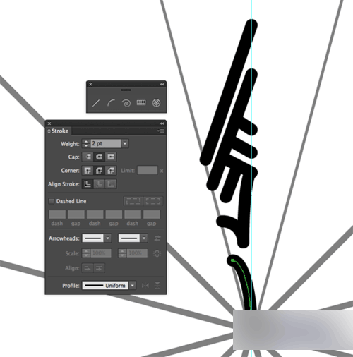 设置一个黑色2pt描边的圆角样式,然后用直线工具和弧形工具在符号的轮廓和参考线之间的二分之一区域画一个图案。利用智能参考线确定直线和弧线端点对齐在参考线轮廓线或顶点上。