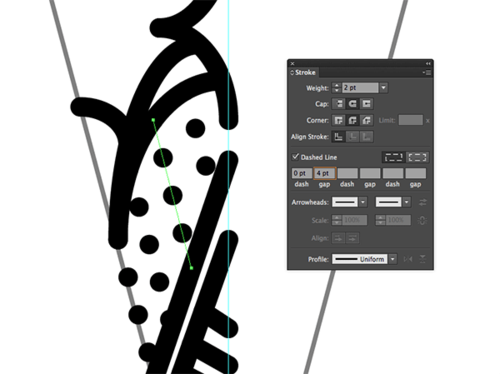 虚线可以给设计加上有趣的效果。在描边选项里选择虚线,然后填入虚线0pt,间隙约4pt。
