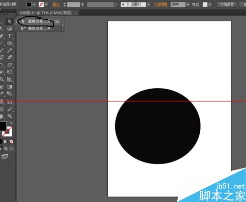 1、首先我们用”椭圆工具“绘制一个椭圆或者圆形。然后选择“直接选择工具”选中椭圆的下半部分点击删除。