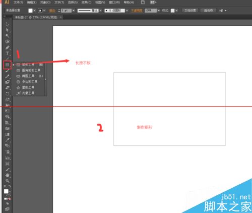 2、制作图像:点击工具箱中的矩形工具,有的时候我们不能找到矩形工具在什么地方,我们点击矩形工具按钮长按住不放,会弹出一个子菜单,点击矩形工具。在画布中新建图像。(如下图)
