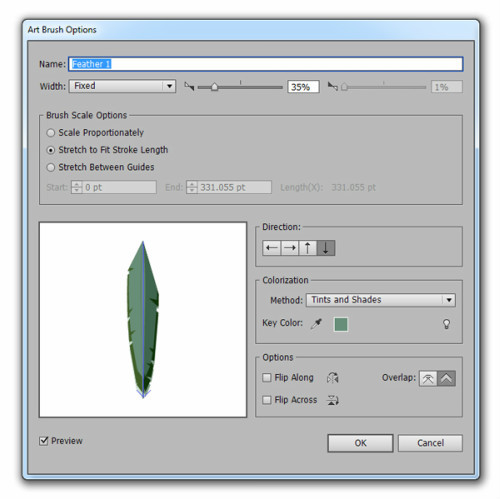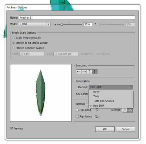 选择其中一组羽毛,点击笔刷面板的新建笔刷。在弹出窗口,选择艺术笔刷,如下图所示设置。为其余两组羽毛重复上述设置。