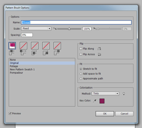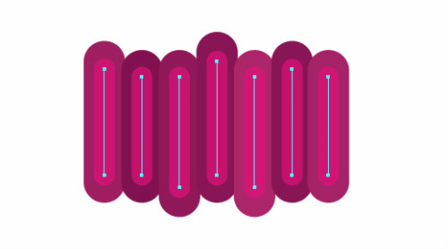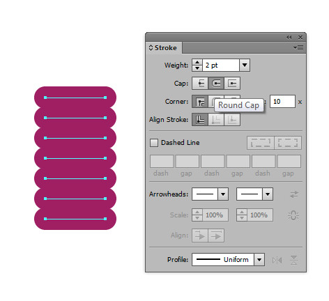 接下来创建环绕的螺线笔刷。使用直线工具创建一条短水平线。使用选择工具摁住alt键复制直线,然后Ctrl+D重复刚才的动作,直到你有一堆短直线。在描边面板中设置2pt的描边,两头设置圆端。