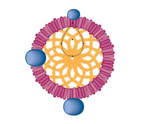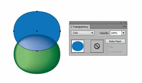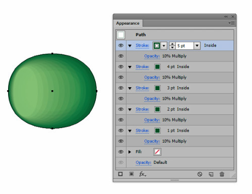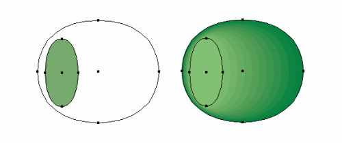 复制两次此图形。使用自由变形工具制作一个小瘦的椭圆。设置大的图形的不透明度为0%,并放置于小图形之下,小图形不透明度为100%。选择两个图形,使用混合工具(Ctrl+Alt+B)设置步骤为10。混合模式为滤色。