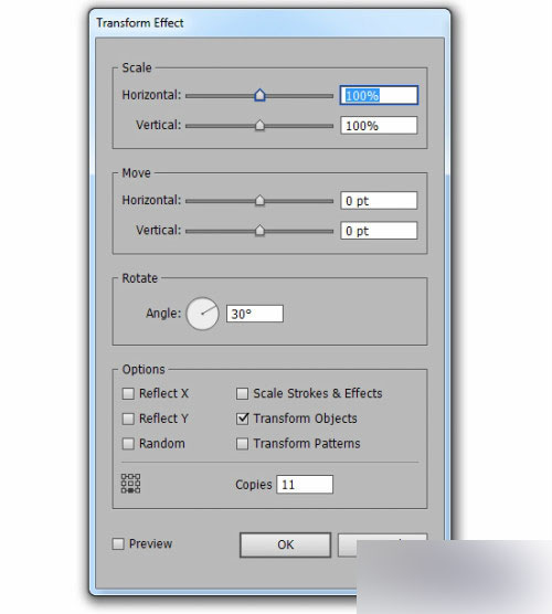 保持水滴状为选中状态。效果扭曲变形变形。我们将从底部为起点旋转此图形。每次旋转30度,一共有12个,减去原始的一个,需要复制11份,如下图所示: