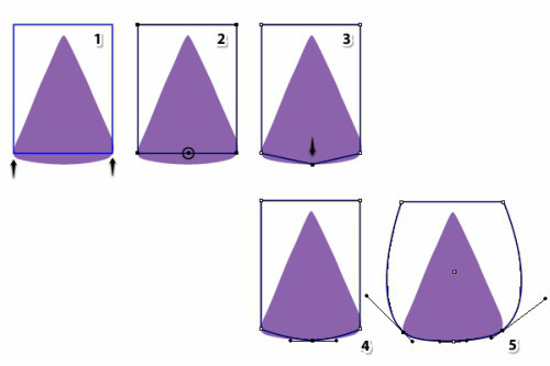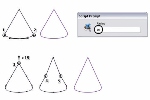 选择点1,2。文件>脚本>圆角脚本 输入调度为10的数值。这样就得到两个底部圆角。选择点3,上移15像素。或者也可以使用 对象>变换>上移来完成这个操作。现在使用删除锚点工具删除4,5点。