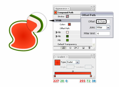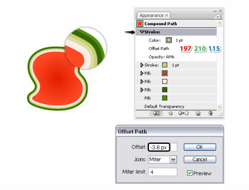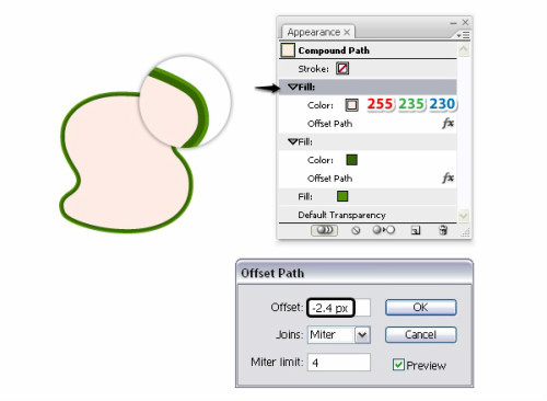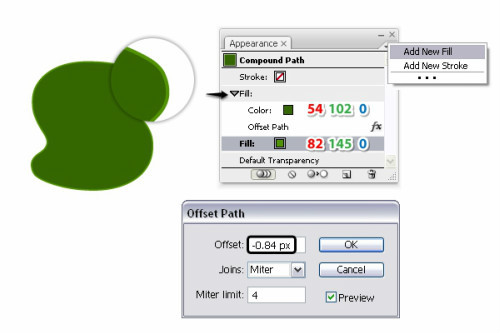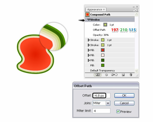 已经算完成填充,现在还需要添加点描边。选择浅绿色的填充层的第一个描边设置如下图数值,效果>路径>偏移路径,输入-2.8Px的偏移路径。这一步是为了在深绿色旁边得到一条细细浅绿色的边,如果看不见你的描边随时调整偏移量。