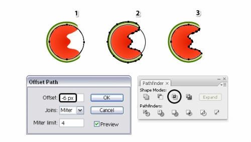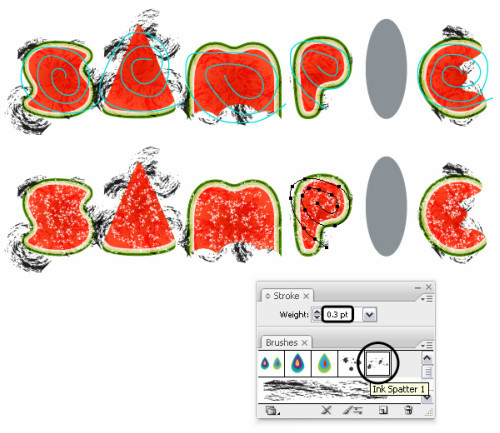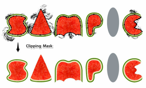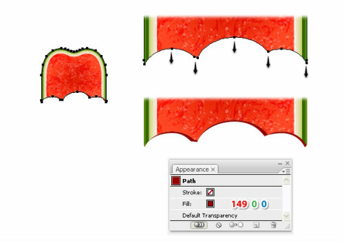 在这一步,需要给那些笔刷纹理添加蒙版,清理干净每个字母的边缘。选择字母S,对象>路径>偏移路径,使用-6px的偏移量。现在你得到了一个小一些的红色果肉区域。将这个形状至于最前(Ctrl+Shift+]),然后在外观面板中点击清楚外观按钮,清除掉所有填色和描边。待会儿需要使用这个形状来添加蒙版。