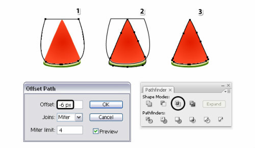 在最开始的时候,我们对所有形状复制了一遍。现在可以用这些副本了。选择fakeA的副本。对象>路径>偏移路劲 输入-6px的偏移量。清除现存的外观样式。选择letterA的一个副本选择这两个副本。在路径查找器中点击交集,你会得到一个果肉区的路径如图: