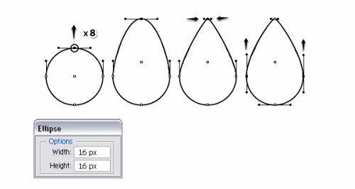 制作一个16*16大小的圆,无填充色,黑色描边。使用直接选择工具,选择顶部的锚点使用键盘上键上移8px,拖动两边的手柄,是他们短点。选择左右两边的锚点使手柄更长一点。命名此图层为"seed-shape"