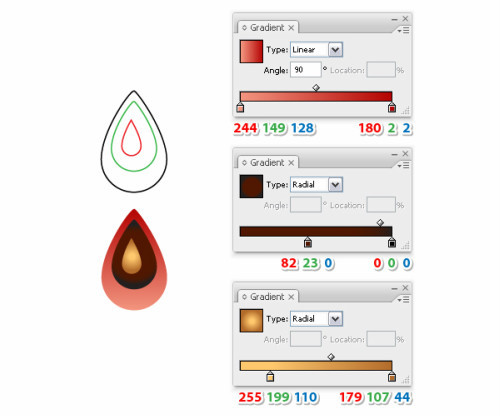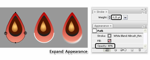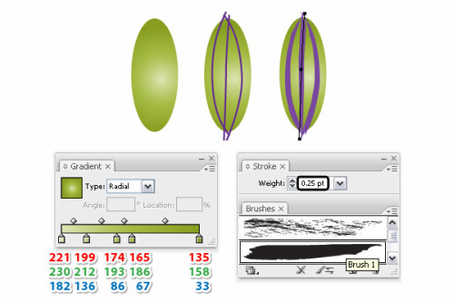 三步就能完成此操作。选择椭圆工具,填充放射状渐变,然后用钢笔工具画三条路径如图。,使用艺术笔刷来描边这个路径,"brush1"设置大小"0.25Pt".