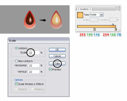 选择seed2 对象>变换>缩放,输入22%,勾选复制。这样我们得到了第三个种子,选择此组的seed-middle,换掉渐变,选择seed-small路径将渐变换成白色填充。其他保持不变。名叫seed3