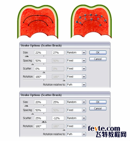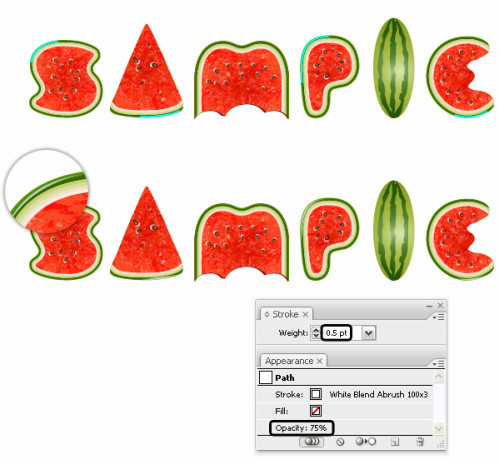 使用钢笔工具在在西瓜的边缘画一些路径。我画了四条,你可以多条,随意。使用混合艺术笔刷>白色混合艺术笔刷100*3笔刷,设置笔刷大小0.5pt,降低不透明度75%。