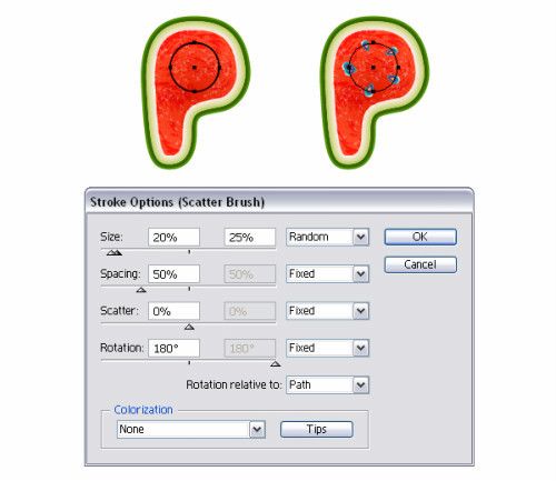 继续字母P,使用椭圆工具,使用同样的描边。不要担心重叠的种子,因为你待会儿可以删掉他们。