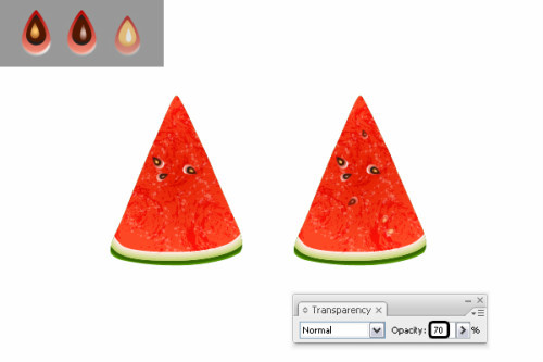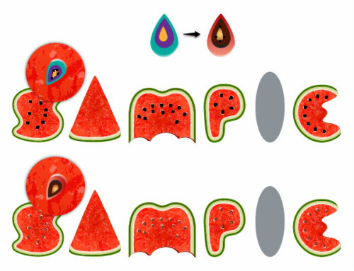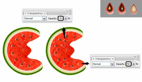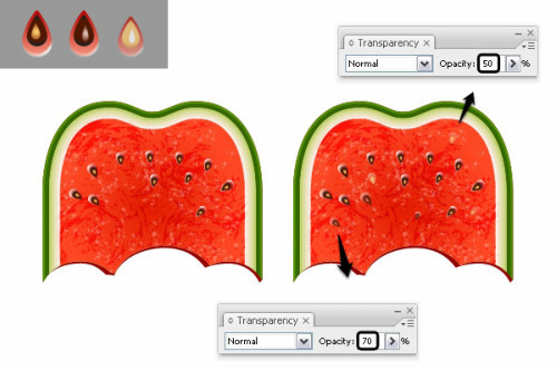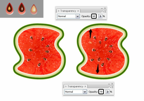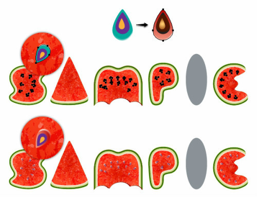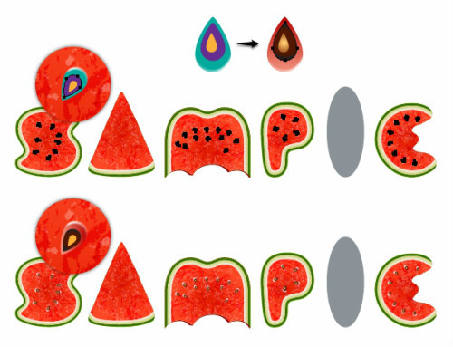 还记得之前创建的seed1,seed2,seed3吗?你可以添加一些seed2和seed3来使西瓜更自然叠加一些seed2和seed3放置一些。降低不透明度50%-70%,下面有些例子可以参照。