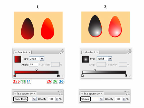 创建一个和seed-shape相似的椭圆,填充渐变,角度50.设置混合模式color burn。复制此图层至于最前,网左上角移动。用黑白渐变填充,混合模式为绿色。