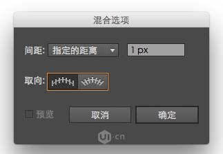 4.选中这两个圆形的图形,找到菜单栏的对象-混合-混合选项,选择指定的距离,点击确定,再选择对象-混合-建立