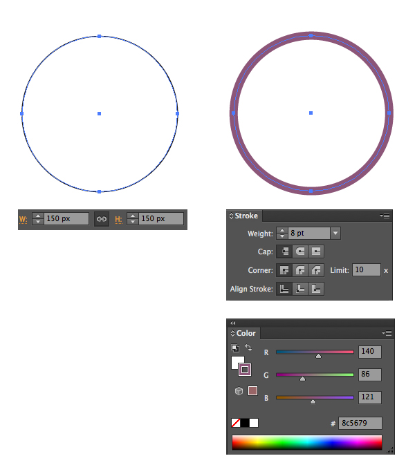 我们先从自行车最基础的车轮画起。首先用椭圆工具画一个150乘以150px的正圆。去掉填充,面变用深紫色,色值如图,描边宽度为8pt,如图: