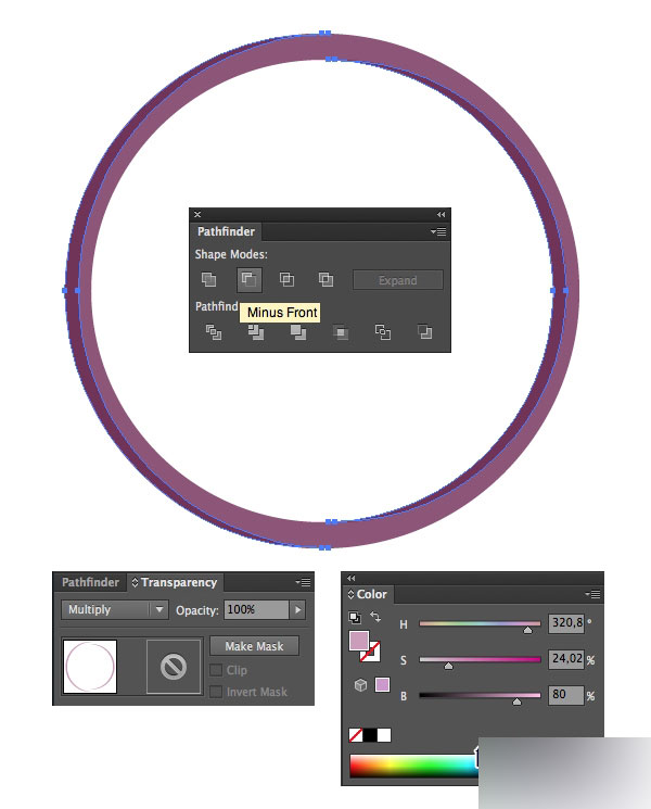 接下来,选择最上面的环形和它下面的那个圆环,(点击shift复选),然后找到路径查找器,窗口-路径查照器。选中两个对象后,点击路径查照器面板上的减去顶层按钮,在透明度面板中选择正片叠加,(找不到在窗口中找)让产生的图形更像一个阴影。之后我们会用同样的方法为自行车的其它部分创建一个半透明的效果。