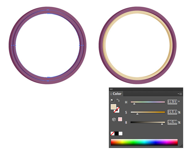 复制最先开始创建的圆形,同样ctrl+F粘贴在前面,按比例缩小(同时按住alt+shift以圆心缩小)最重效果如图,并把填充颜色改成浅米黄色(色值在图中,找不到HSB模式的同学点击颜色面板右上角的向下小箭头就看见了)作为车轮里面的轮辋。