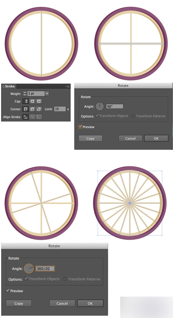 现在再加一些车轮里面的网丝,选择左侧工具栏直线工具,按住shift画水平方向的直线(可以画水平、垂直和45度的直线),宽度设置为3pt,描边颜色还是step3中的米黄色(选中对象后,按I使用习惯工具直接选择轮辋的颜色)选中所画的直线,双击工具栏的旋转按钮,输入90度,点击复制按钮,最重效果如图。