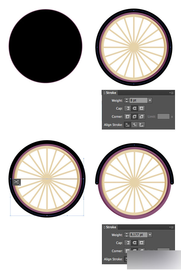 使用工具栏的剪刀工具,在黑圆的左右两个锚点分别点击一下,算是把一个圆分成两半,选中下面的一半,按delet删掉,至于上半部分,宽度换成8pt,断点换成圆角。(貌似他给的尺寸达不到下图效果,那就自己调整一下大小,差不多就行)如下图