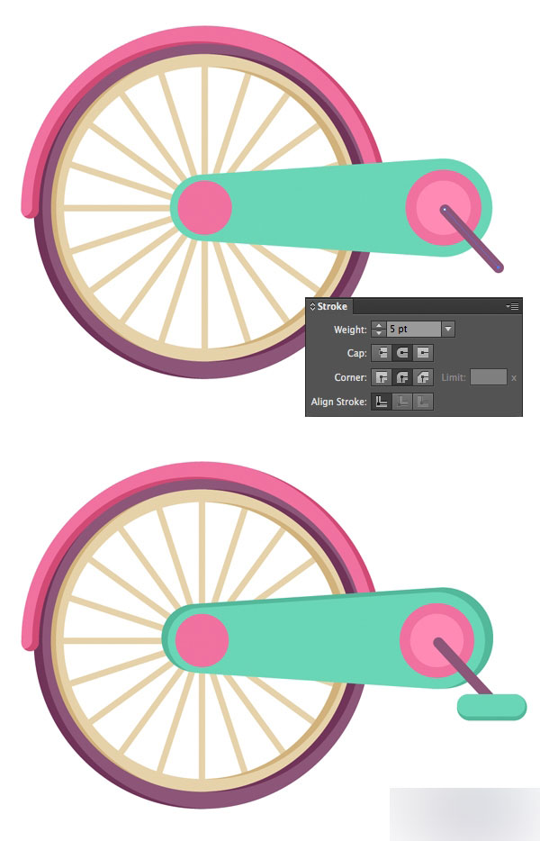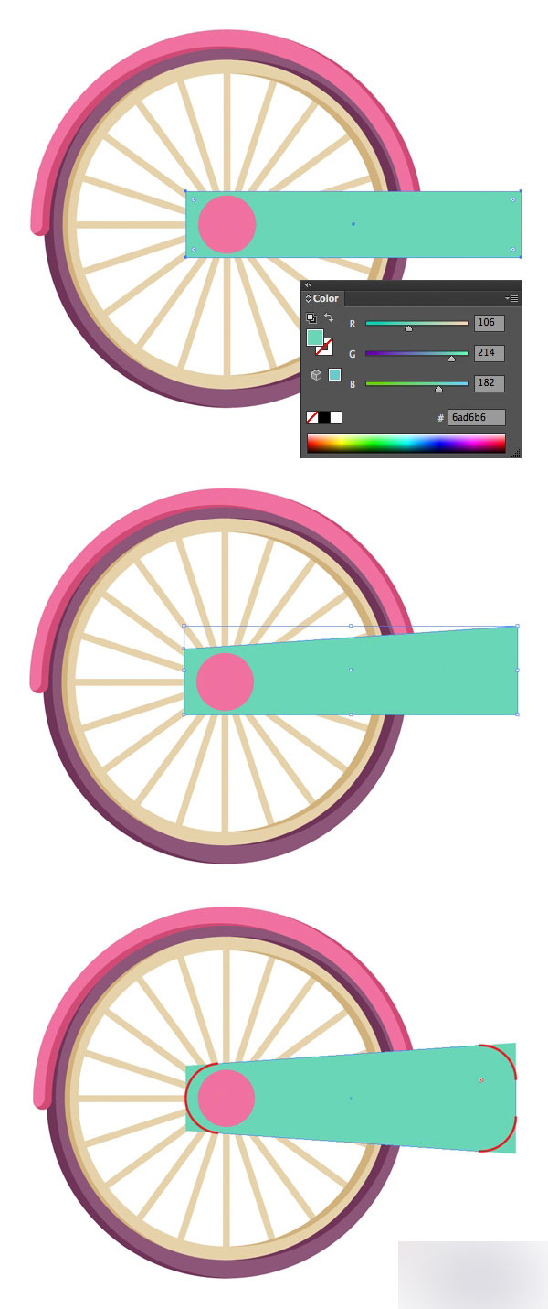 时间关系俺就不按原文翻译了, 我直接说怎么画,选择上面画的车轴,按住alt并移动鼠标复制,放到如图位置,然后在ctrl+v复制一下,ctrl+B粘帖到后面,不要点其他,直接放大(shift+alt),放大到和图中大圆效果差不多,然后选择前面较小的圆,填充一个更亮一点的粉色,区分开来就可以了