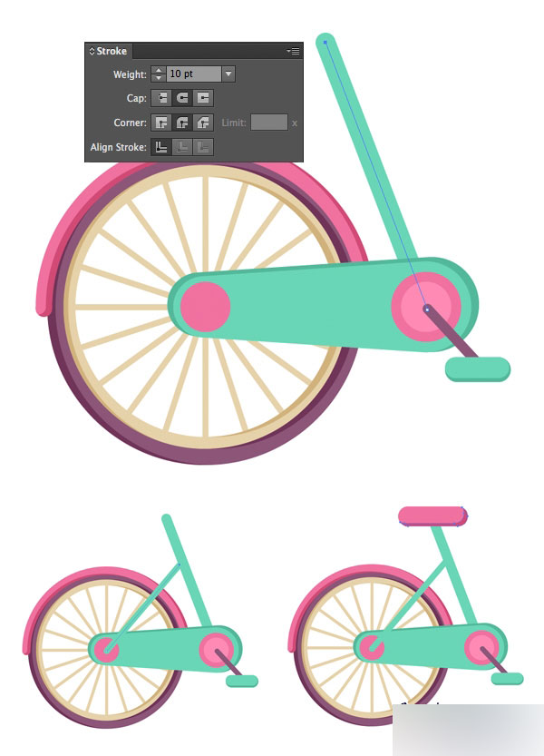 再画一个宽一点的10pt的直线,作为座管,再画另外一个稍微窄一点的线,调整位置和角度和座管差不多垂直,形成一个三角形,三角形更坚固你懂得,然后在上面添加一个粉色的圆角矩形作为车座,阴影你也懂的。