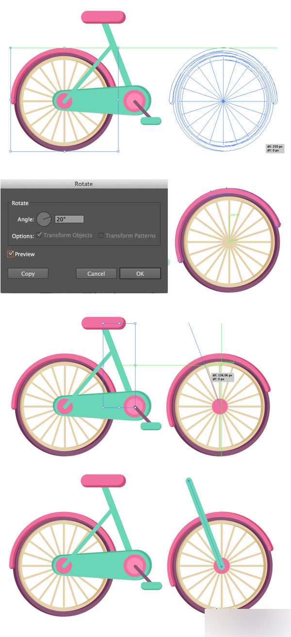 选择车轮部分,一定要都选上幺,按住alt复制,作为前轮,再单独选择前刮泥板,点击旋转工具,按住alt选择旋转圆心,就拿车轮圆心做圆心吧,再在跳出来的面板中输入20,确认(不知道你注意了没有,自行车的前刮泥板一般是这样的)