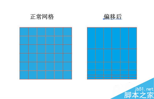 在[矩形网格工具选项]对话框中设置[水平分隔线]或者[垂真分隔线]中的[倾斜]参数值,即可得到偏移网格效果。