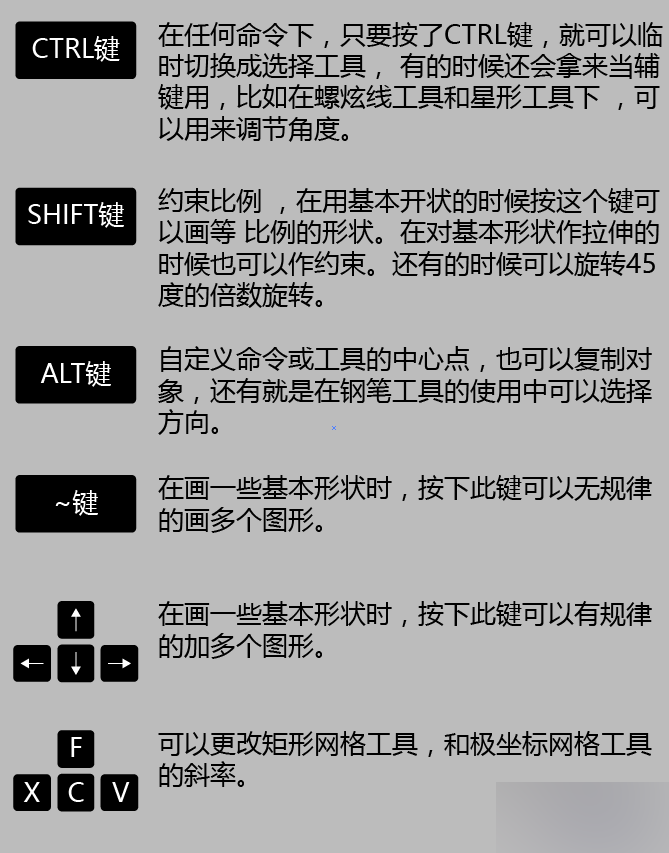 方向键: 在画一些基本形状时,按下此键可以有规律的加多个图形。